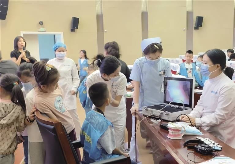 r“通过AI口腔内窥镜看到自己牙齿上的菌斑时,孩子才真正愿意认真刷牙。”今年8月,兰州市口腔医院策划举办“齿界奇趣体验营”研学活动,活动邀请雁滩周边社区学生走进医院,通过沉浸式科普体验、互动式健康实践,将公益性服务与创新科普深度融合,为孩子们播撒口腔健康的种子。为精准消除儿童看牙焦虑,活动开展分龄互动实践模式:低龄段儿童化身“小小牙医”,身着定制迷你白大褂,在儿童口腔科诊室手持口镜为同伴进行牙齿检查。角色扮演中,孩子们从“被检查者”转变为“健康小卫士”,在医生指导下用卡通工具完成操作,诊疗床畔的紧张感悄然转化为探索的乐趣。
