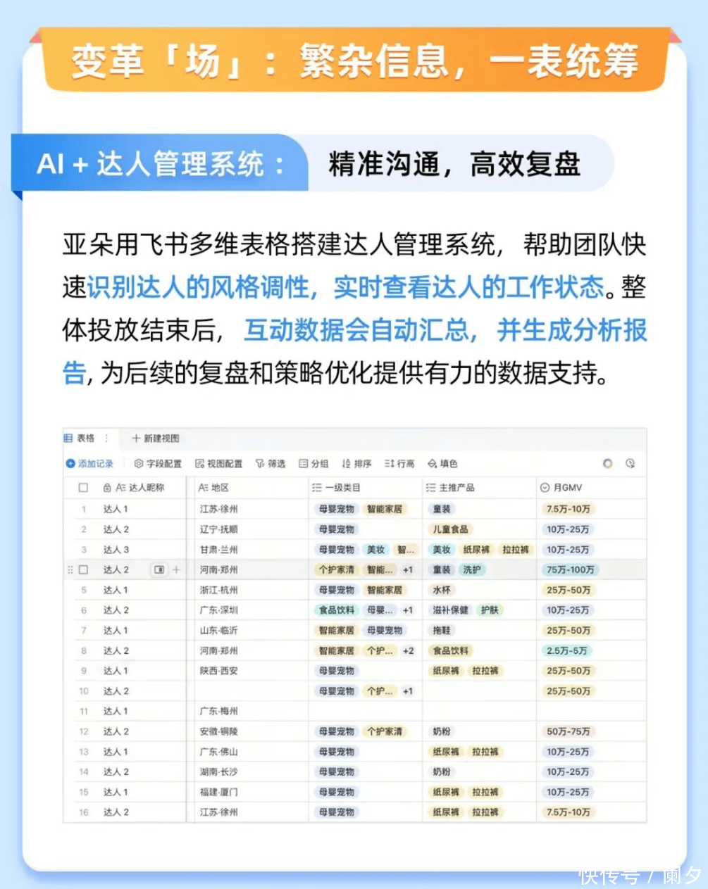 四年时间,亚朵旗下的零售品牌「亚朵星球」已经跃居中国家纺行业TOP4,2024年卖出超过 300 万只深睡枕、77 万条深睡被。在日常大促中,亚朵星球通过「AI+飞书多维表格」的组合,实现了达人管理、直播运营、数据整合及用户反馈等场景的提效。也是通过对用户反馈源源不断的追溯和分析,促成了亚朵星球单品的一次又一次迭代升级。