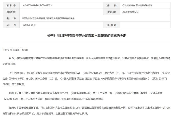 8月12日,四川证监局下发一纸行政监管措施决定书,剑指川财证券债券交易业务存在违规行为,并对其出具了警示函。