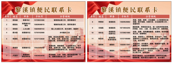 黎溪镇积极调整工作思路,变“群众找上门”为“干部亮号码”,变“层层转办”为“直通直达”,主动亮明联系方式、扛起履职责任,变被动接访为主动服务。群众无需绕弯路,对照公示信息就能直接联系分管领导,让急难愁盼诉求第一时间直达决策层,打通服务群众“最后一米”。
