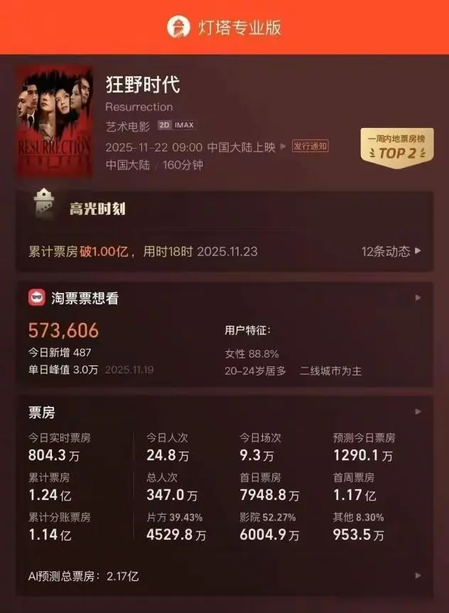 结果这次翻了个大车,《狂野时代》预售票房看着稳稳当当的,甚至还有人猜测这部电影上映之后,说不准能冲一下10亿。
